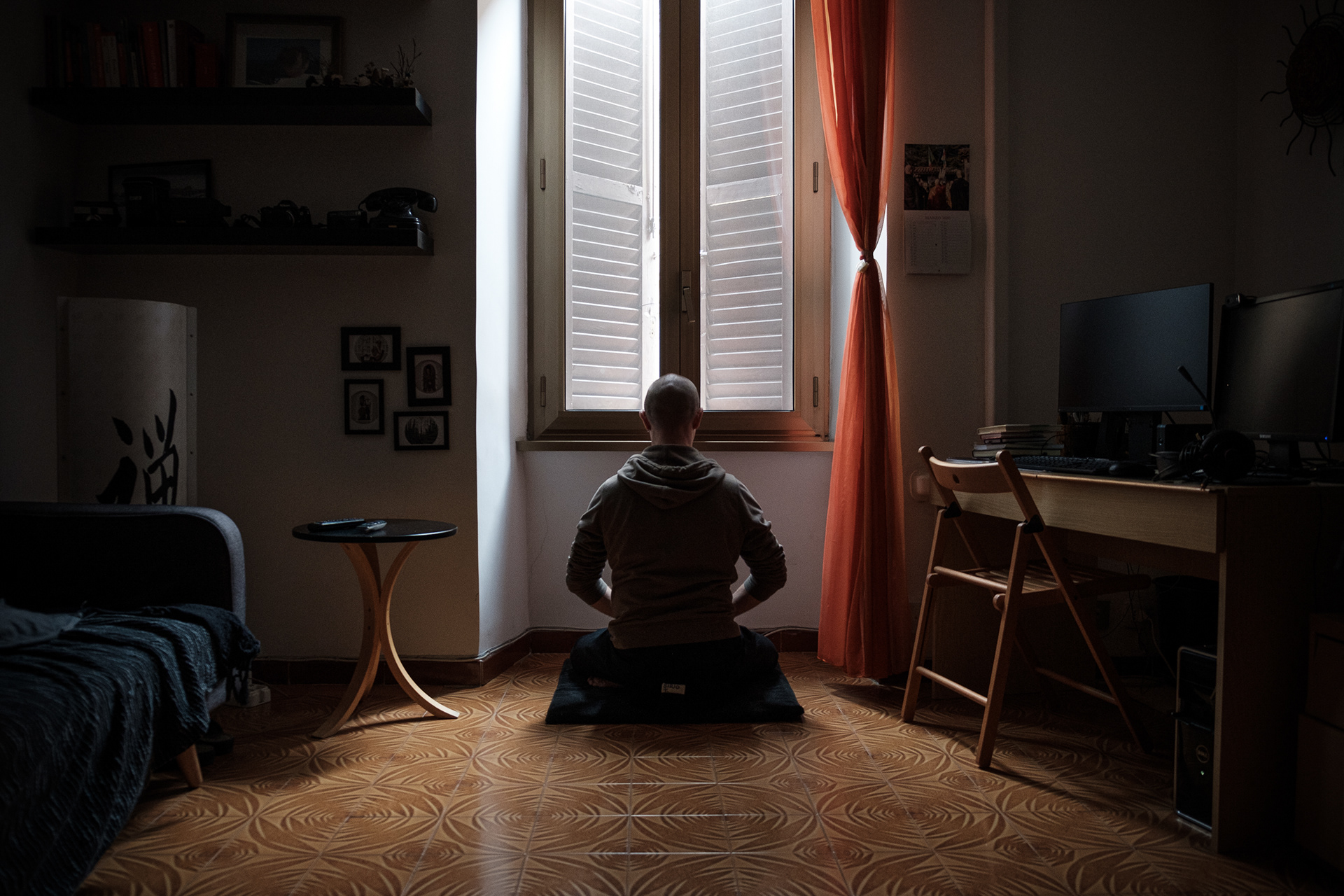 Except for the few times we've bought something to eat, we are home since 9 March 2020. Before the quarantine Claudia worked in a sport center, now closed due to the coronavirus emergency. She also would have take a open competitive exam for a job in public administration. I am a photographer currently jobless. We have no income and a very vague future prospect right now. Claudia's family lives in Abruzzo region and since we are in Rome it is not yet clear when she will meet them again. Our apartment has become a refuge, gym, meditation room and family life center. On good weather days we go up to the condominium terrace, the Ostiense district usually very crowded is strangely silent.